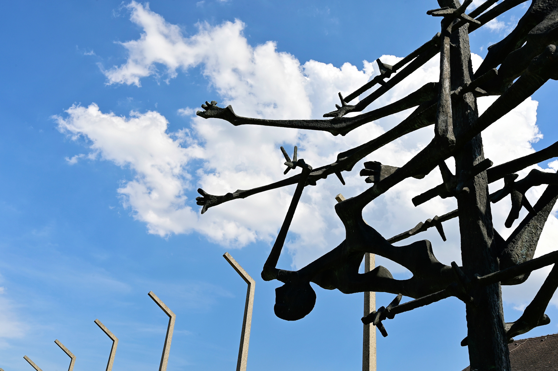 scultura che ricorda le atrocità dei campi di sterminio. Le forme scure secche ed un corpo che si allunga deformato sul cielo azzurro mani, piedi...