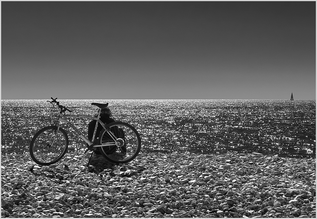 Sarà una scena già vista, ma il controluce brillante e l’opportuno viraggio in bianco e nero creano una sorta di continuità tra sassi e mare davvero molto coinvolgente… Buona anche la composizione, con bicicletta e ciclista in primo piano bilanciati dalla piccola vela in lontananza Ok! Mi piace Smile