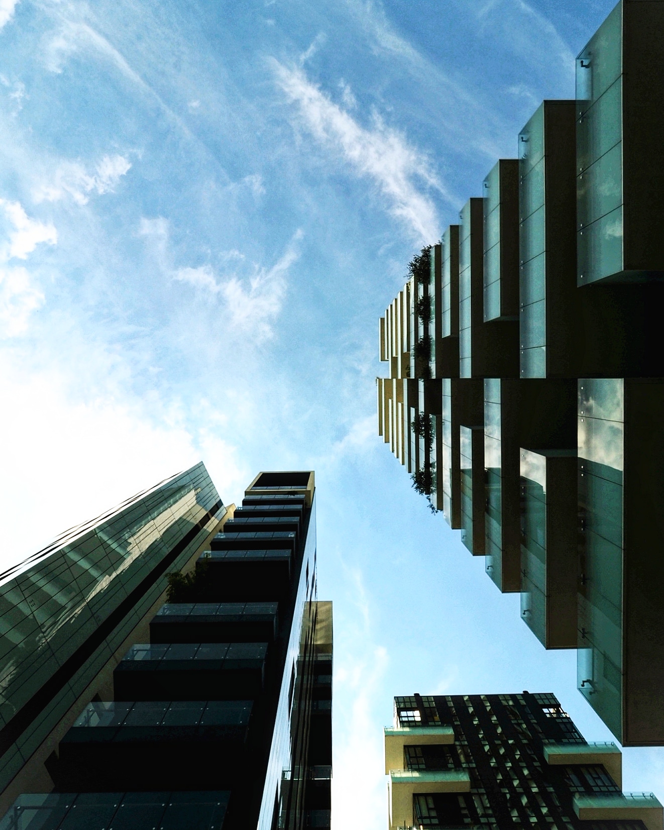 Uno scatto con il naso all'insù dalla grande verticalità in cui lo scontro tra un variegato e luminoso cielo e la moderna architettura ha un ruolo fondamentale.