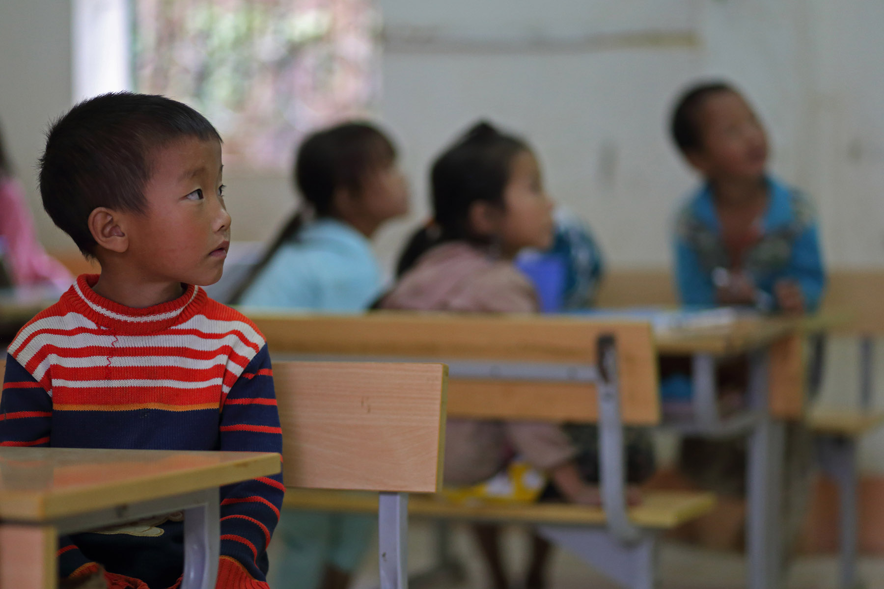 Ho cercato invece di valorizzare lo sguardo attento e asiatico e il vestito del bambino decentrandolo. In questo modo lo sguardo si perde verso la lavagna mentre gli altri bimbi fanno da contorno....non so se sia meglio così o con anche gli altri a fuoco.