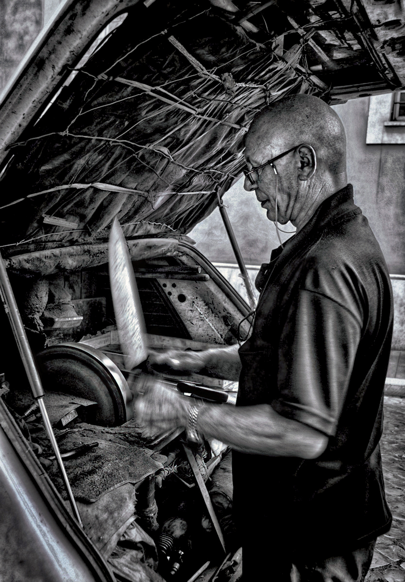 Per quanto riguarda l'immagine anche a me, come sottolineato molto bene da Claudio, piace moltissimo la scelta dei tempi che ha arricchito di dinamismo dove occorreva (mola, mani, coltello) senza intaccare ciò che era bene restasse definito e fermo (volto, veicolo improvvisato da lavoro, sfondo).