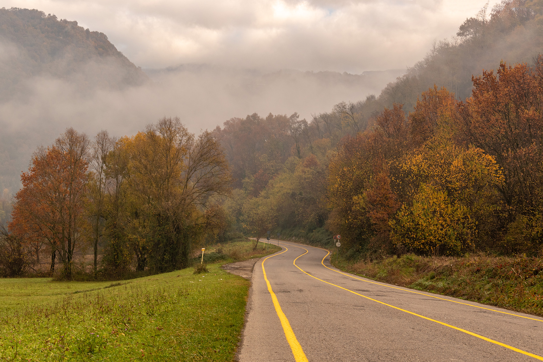 si incominciano a vedere gli alberi colorati e le strisce gialle della strada ben si combinano col fogliame, brava Elis.