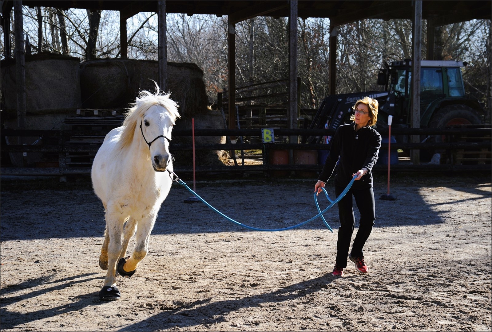 La scena talmente è viva che sembra bucare lo schermo: il cavallo intento a trotterellare, la signora tutta presa nell'esercitazione.