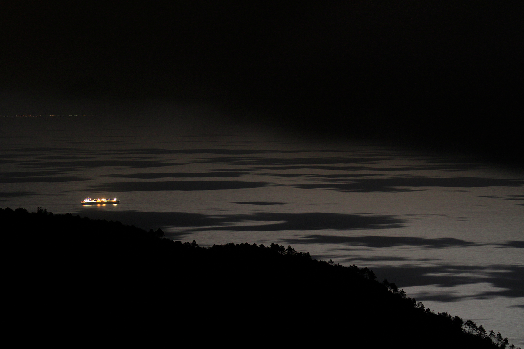 Le luci colorate della nave, come ovvio, risaltano in maniera netta nel buio dello scenario e la piccola e flebile striscia illuminata sullo sfondo ha senso.