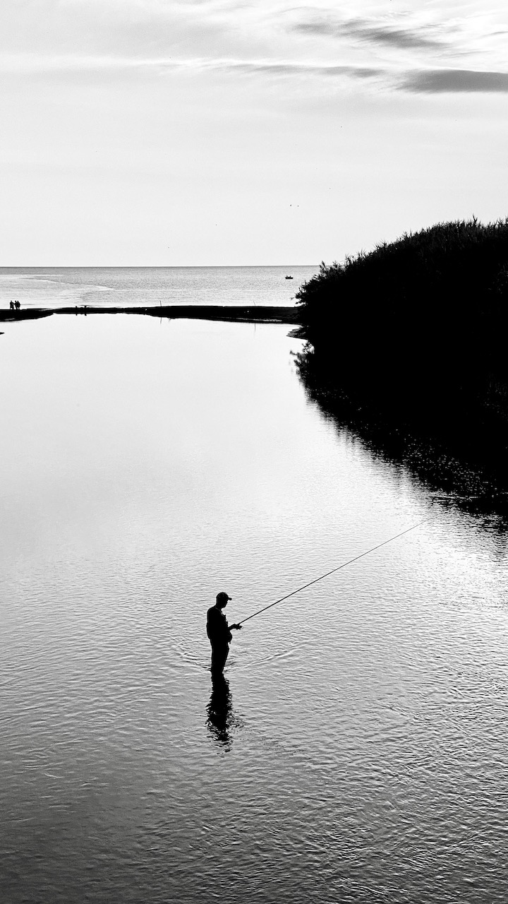 Il bianco e nero basato sugli estremi della gamma tonale si addice molto bene alla scena, la suddivisione orizzontale è corretta, personalmente avrei posto il pescatore solitario sul terzo di sinistra ed eliminato i piccoli comprimari in alto enfatizzandone così l'isolamento.
