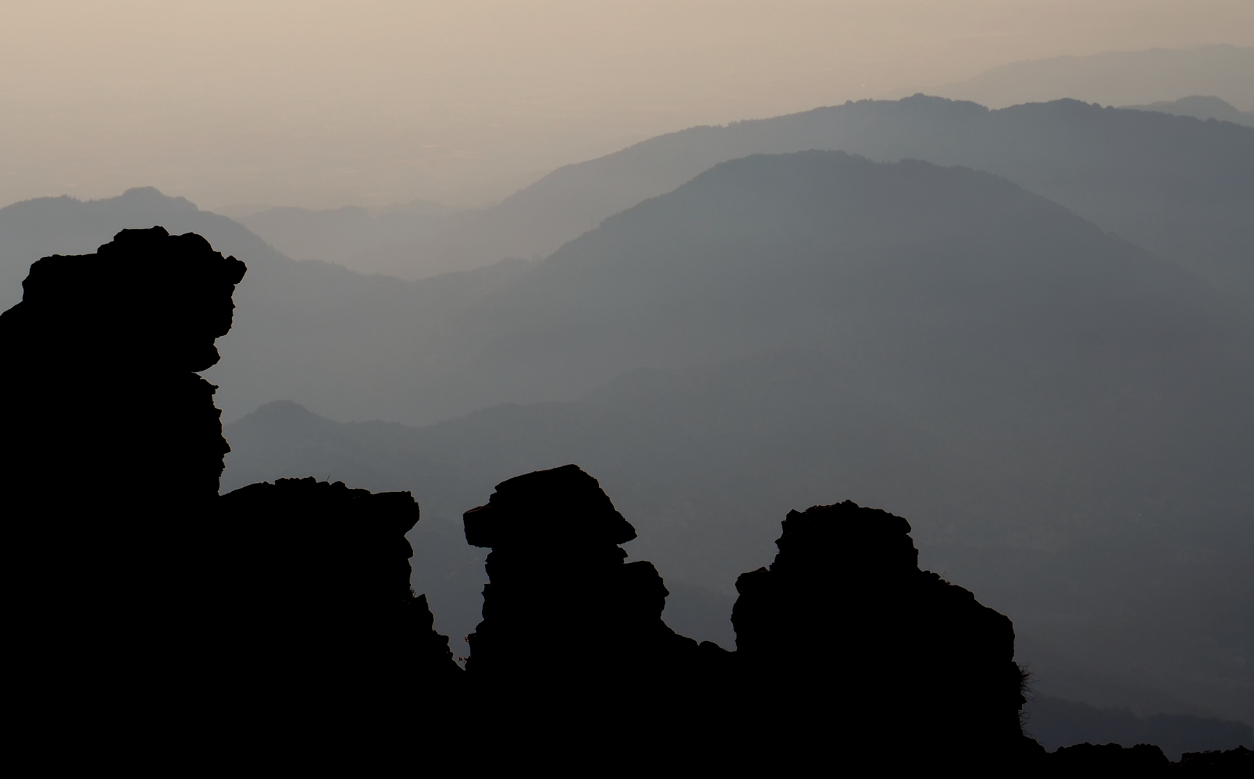 immagine molto suggestiva con i profili delle rocce in primo piano che sembrano vigilare sulle montagne in lontananza. Mi piace molto