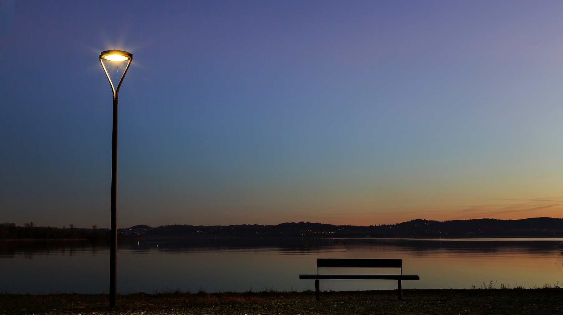 Un lampione, una panchina ed i colori dell'ora blu su uno specchio d'acqua, gli ingredienti per una buona foto ci sono tutti.