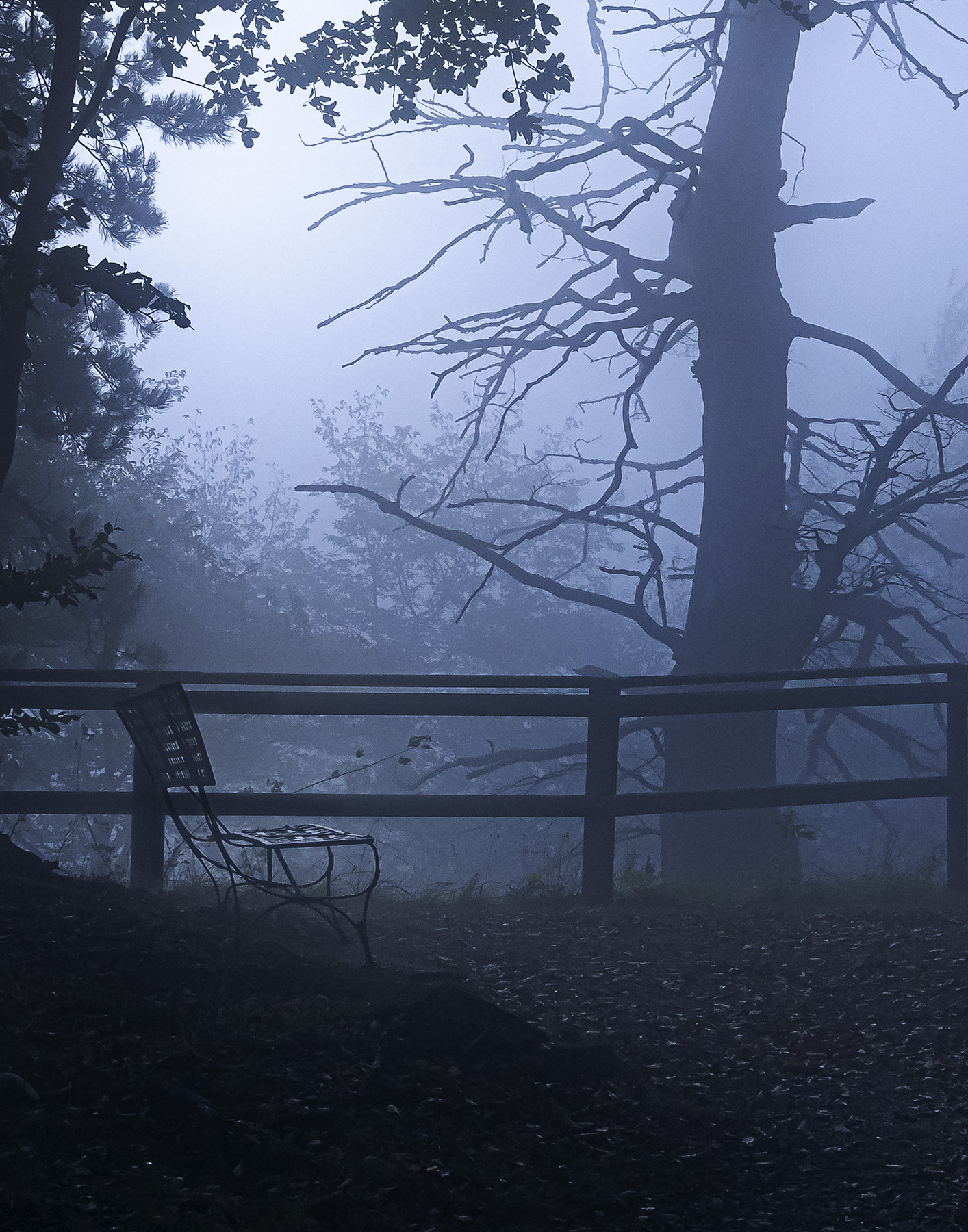 panchina solitaria in atmosfera ovattata e vagamente spettrale. Una buona proposta