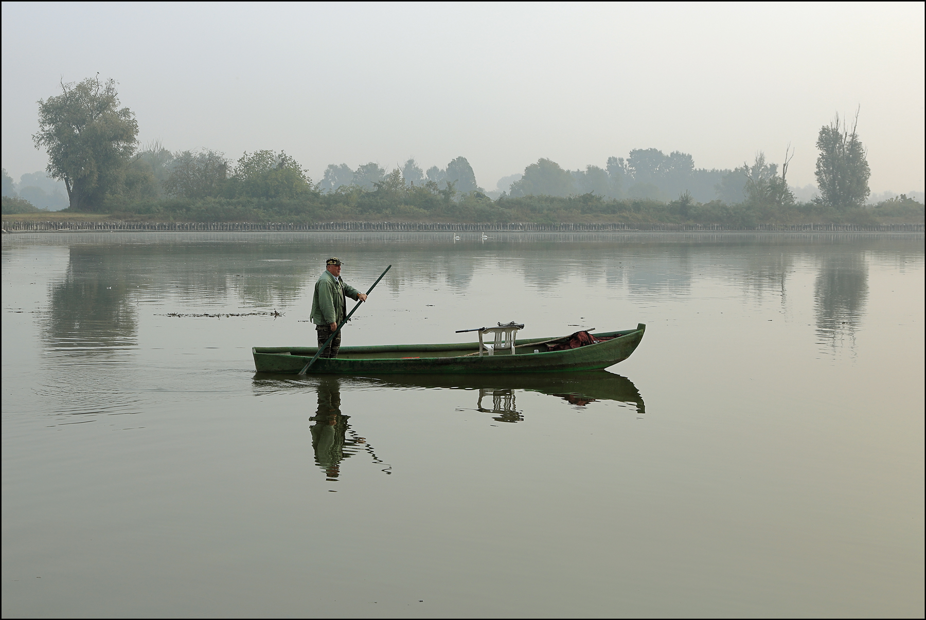 La composizione è molto curata, uomo sul terzo che non interferisce con lo sfondo, barca centrale ed i due alberi ai lati a fare come da sentinelle.