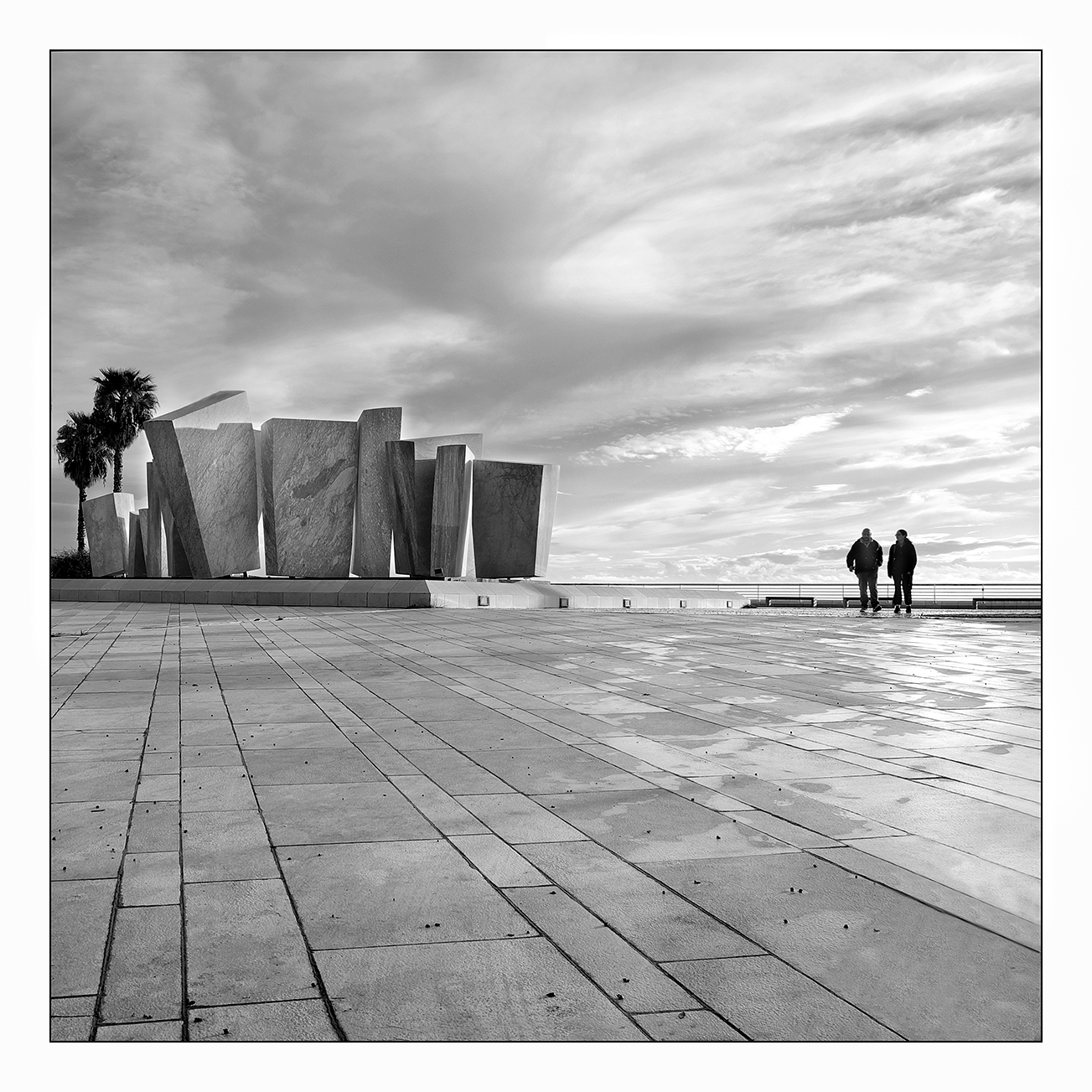Le linee del pavimento che portano alle sculture, il cielo abbastanza movimentato che sembra convergere anch'esso sulle opere d'arte, sono ben bilanciate dalle due persone sulla dx.