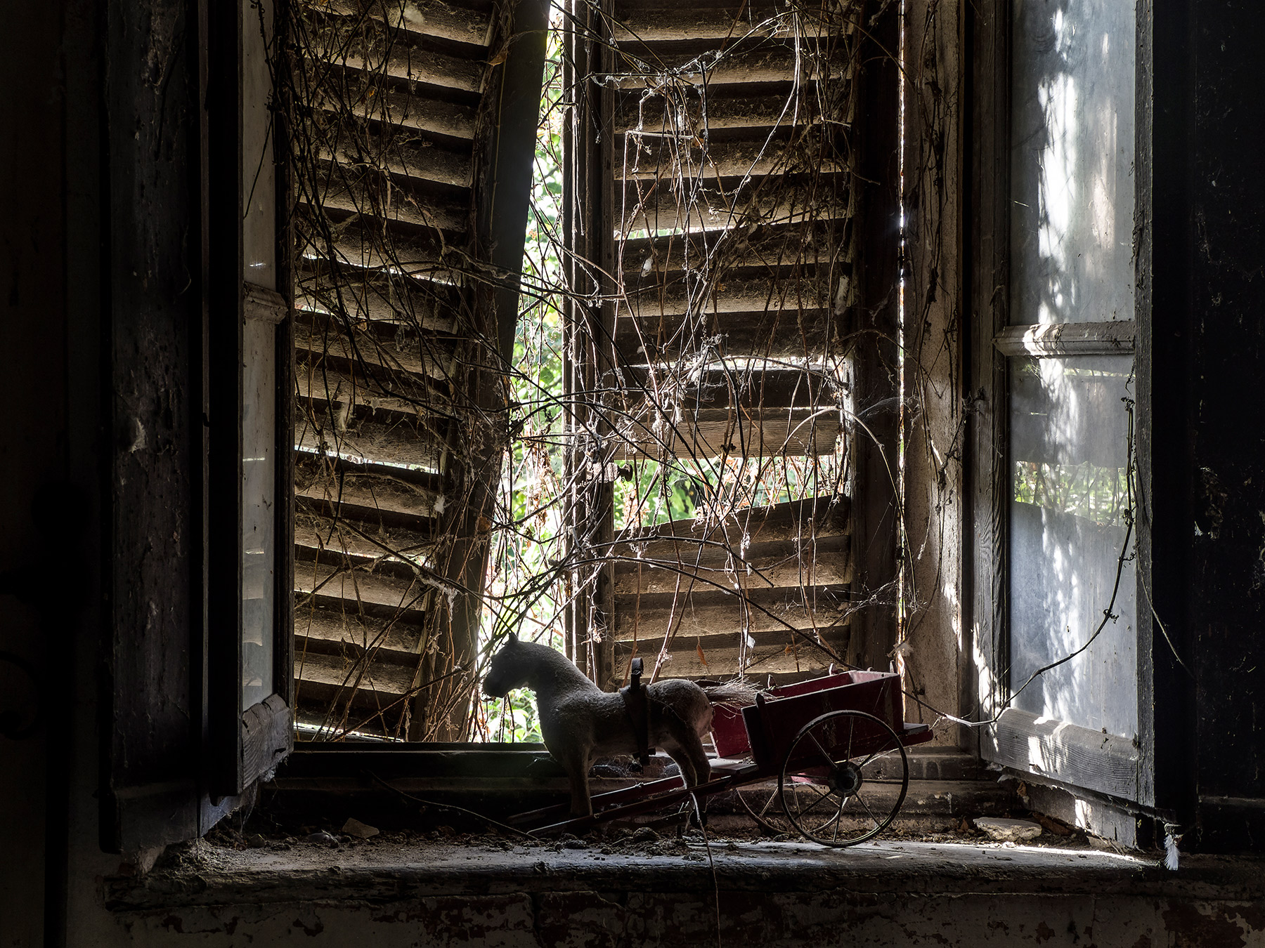 Il vecchio infisso scassato fa penetrare la giusta quantità di luce che mette bene in risalto gli innumerevoli dettagli dell'immagine e rende comunque gradevole la scena, il vecchio giocattolo è malinconia pura.