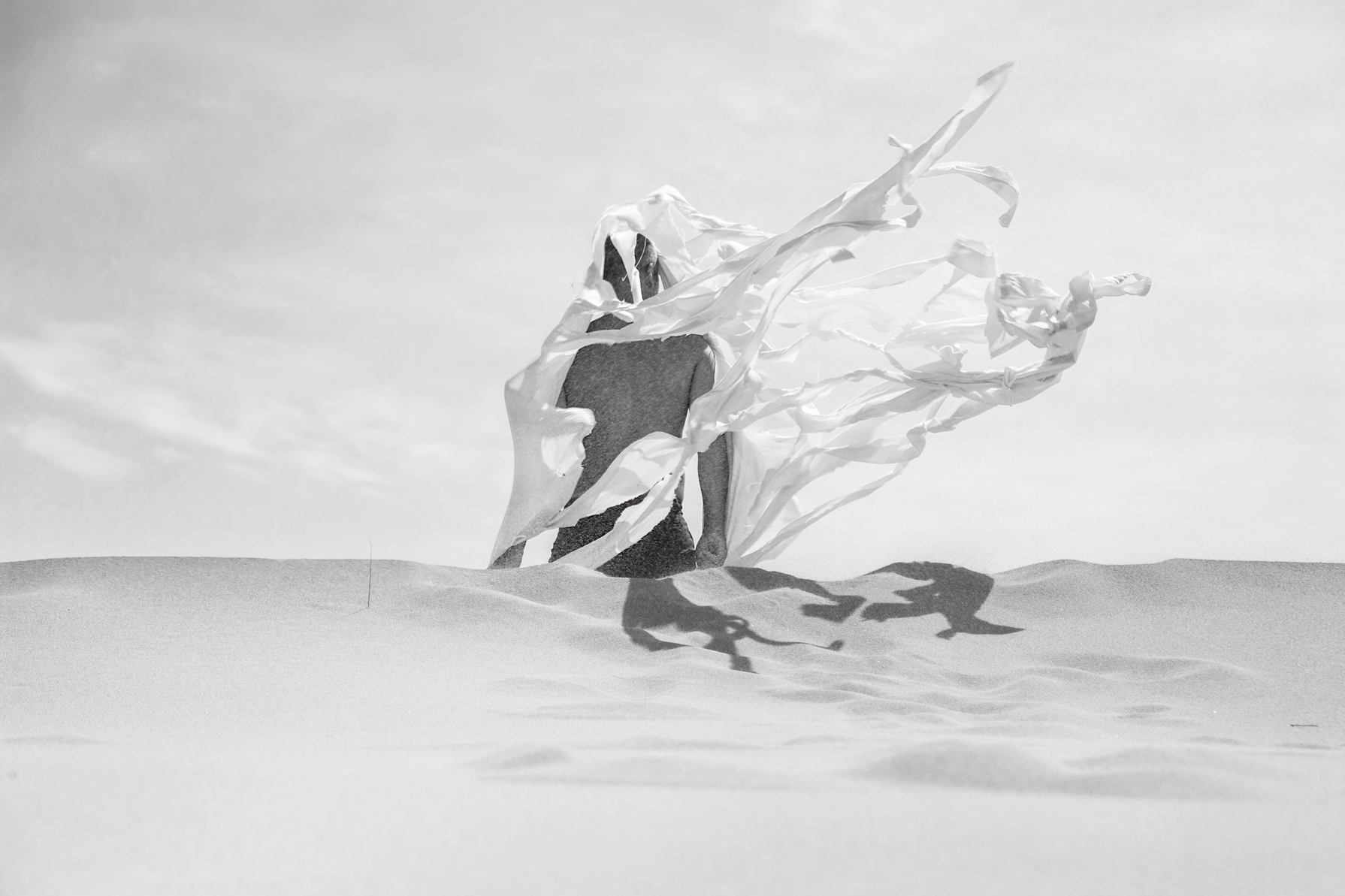 E' una cosa che colpisce come in questa foto il vento significhi forza e leggerezza insieme, che si manifestano fondendosi in un movimento incontrollato che al tempo stesso libera e imprigiona, graffia e accarezza, solleva e inquieta. E così bloccati da un' intricata barriera fatta dai leggeri granelli di sabbia di questo deserto spettinato dal vento, vediamo l'uomo che si allontana, senza potergli vedere il volto, tenendoci il dubbio se stia camminando forte e padrone del suo destino, con la sua prigione che si apre e si abbandona al vento o mesto e rassegnato ad una vita di prigionia da cui non può districarsi.