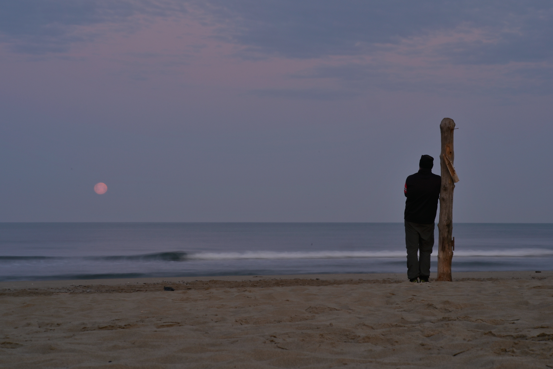 La luna rosa, il cielo che si tinge di tinte rosate, la dolcezza dell'acqua, l'uomo che scruta il mare, sono tutti elementi che compongono in modo poetico e intenso lo scatto.