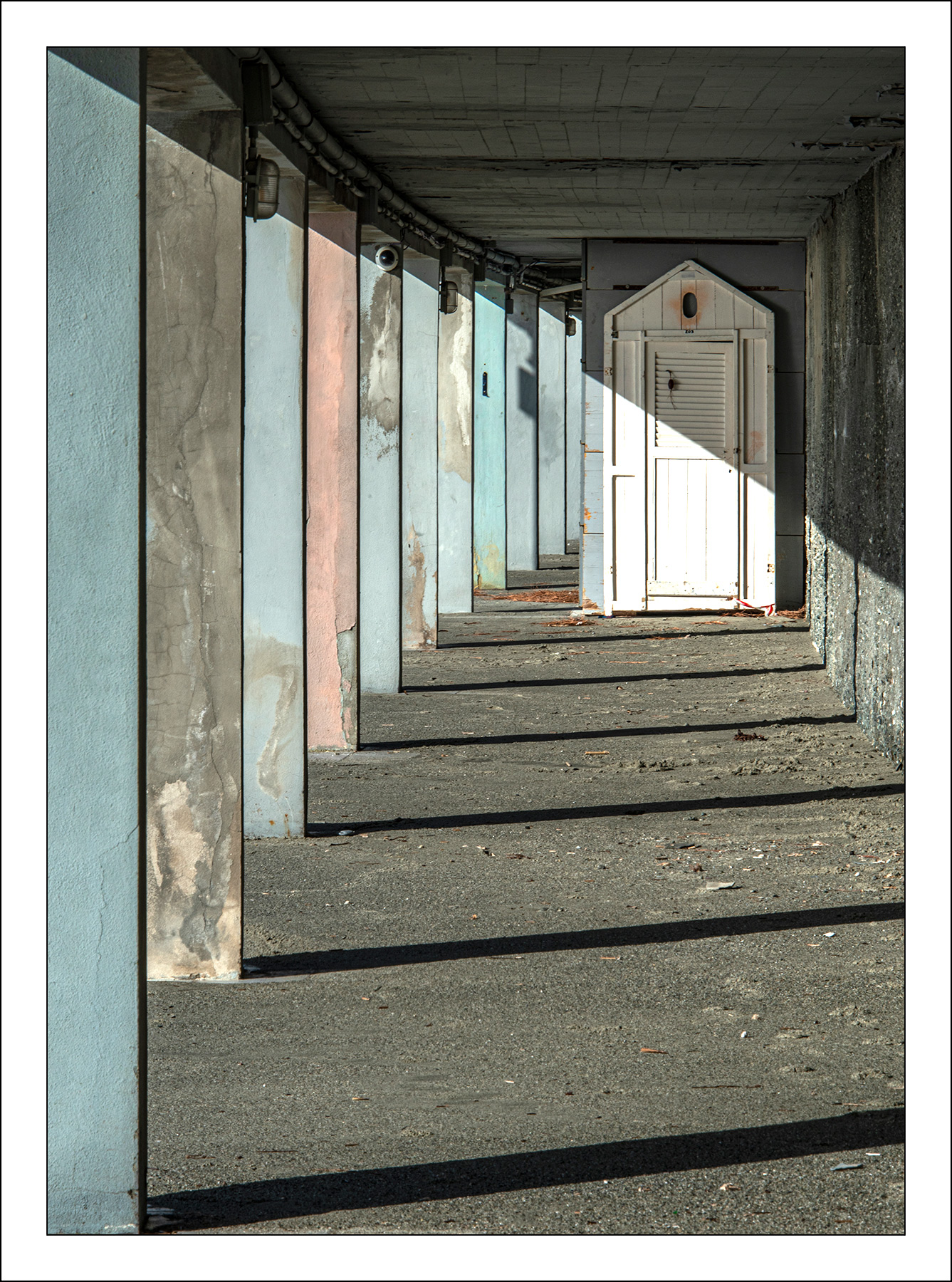 Un lungo colonnato dalle varie sfumature di colore, il gioco ritmico creato dalle ombre proiettate dalle colonne, la porta che interrompe la visione ritmica per divenire essa stessa oggetto coprotagonista dello scatto.