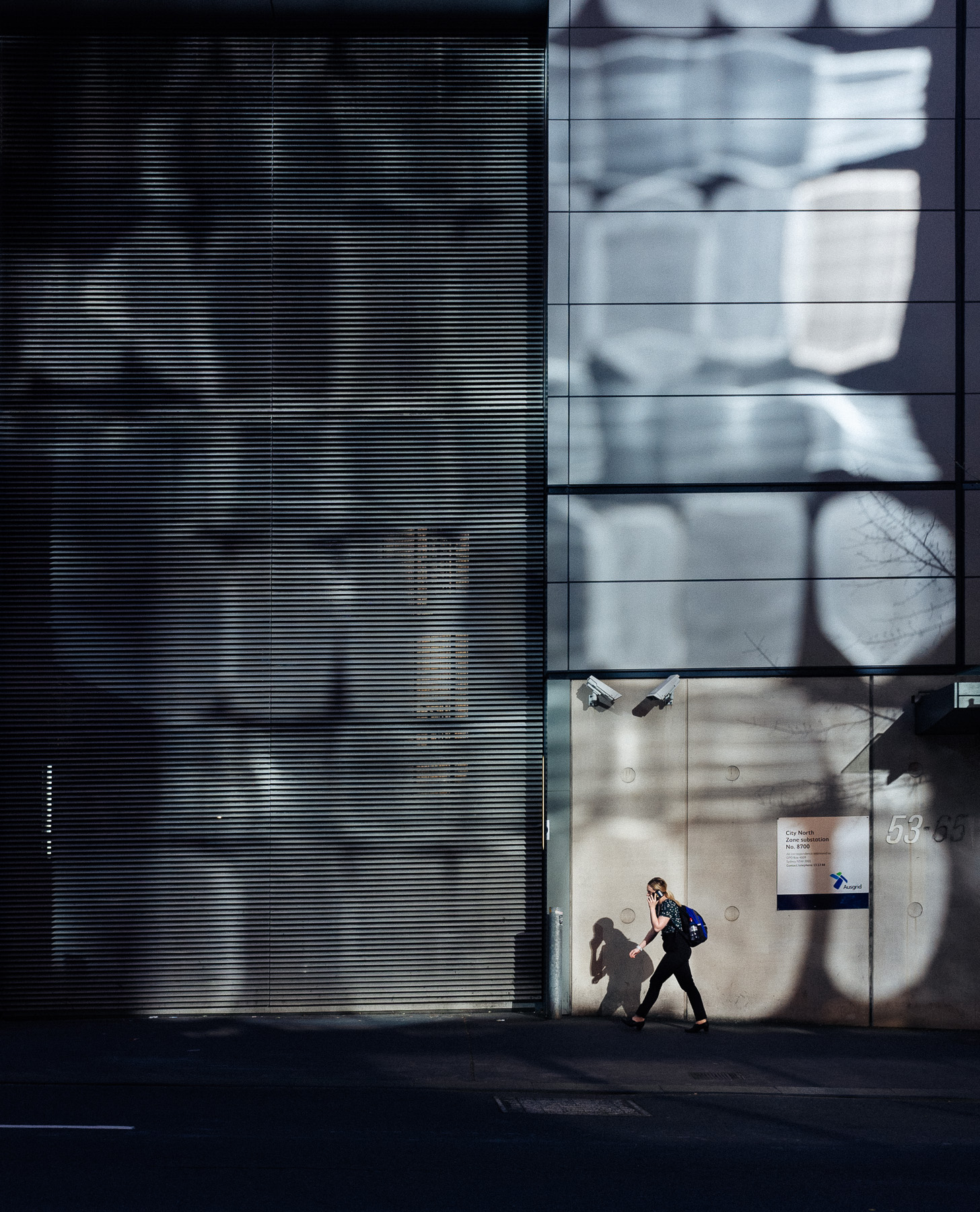 La parete che fa da fondale divisa quasi simmetricamente tra luce ed ombra, la parte plissettata ed il gioco di chiaroscuri, riflessi, proiezioni, non capisco bene cosa siano, sono affascinanti ed unici, la passante (peccato sia al telefono ) ha una bella falcata, è perfettamente in luce, proietta una discreta ombra sul muro ed è addirittura tra le due telecamere , difficile fare di meglio.