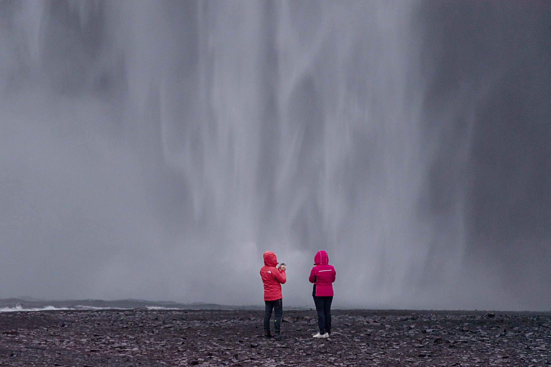 Mi piace la quasi monocromaticita' dello scatto che esalta il rosse delle giacche delle persone davanti alla cascata.