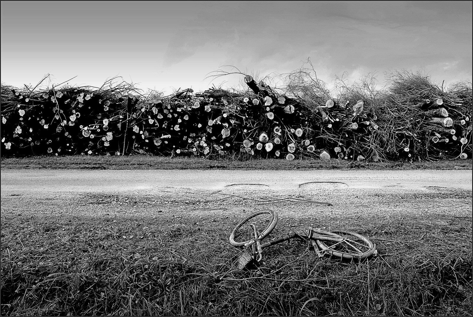 E questo bianconero sa ben raccontare con gli elementi in gioco. Concettualmente la bicicletta per terra in mezzo all'erba richiama la catasta di legna recisa.