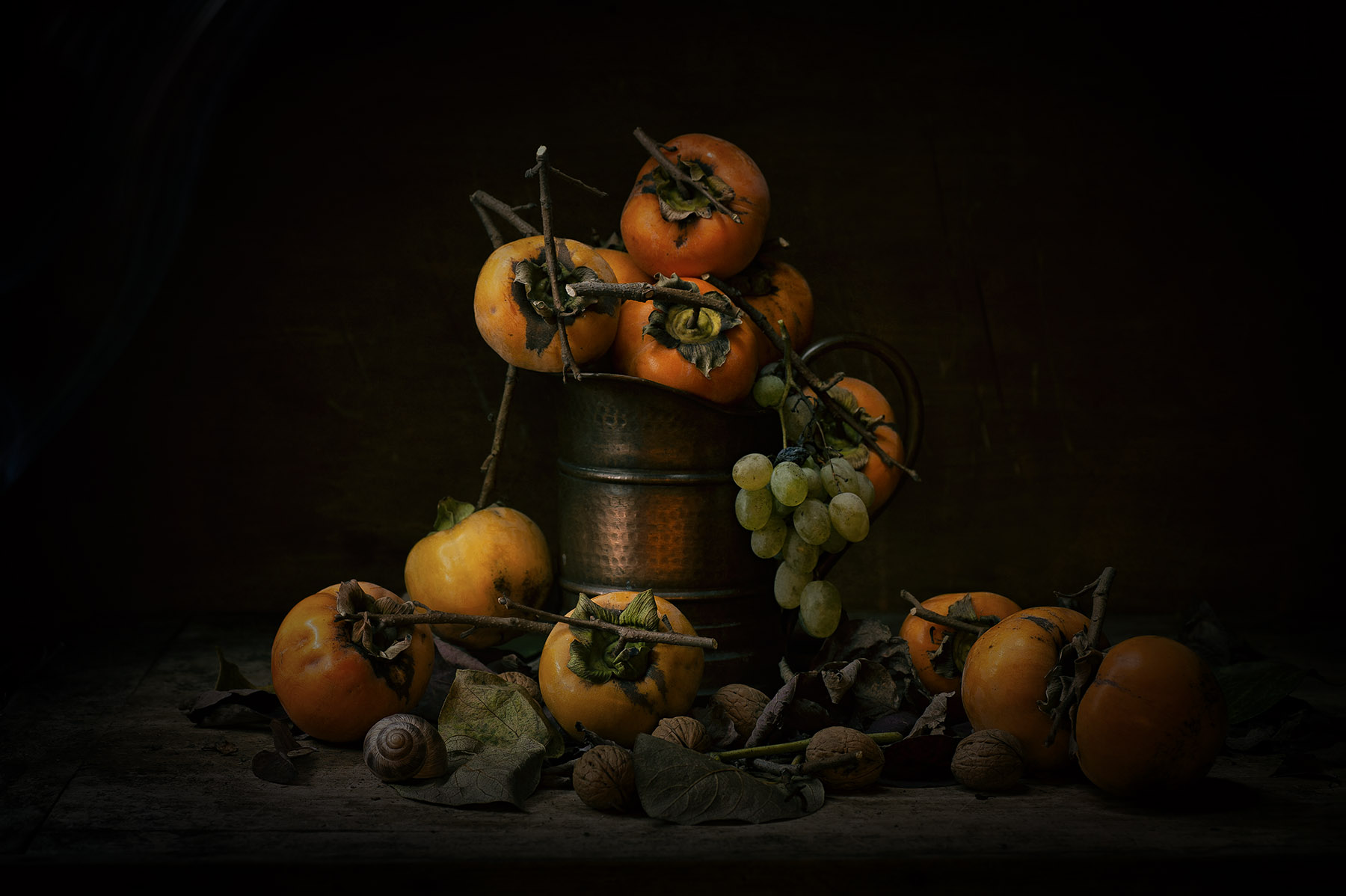 | Composizione a simmetria centrale! I cachi disegnano un ottimo triangolo. Ottima atmosfera autunnale! |