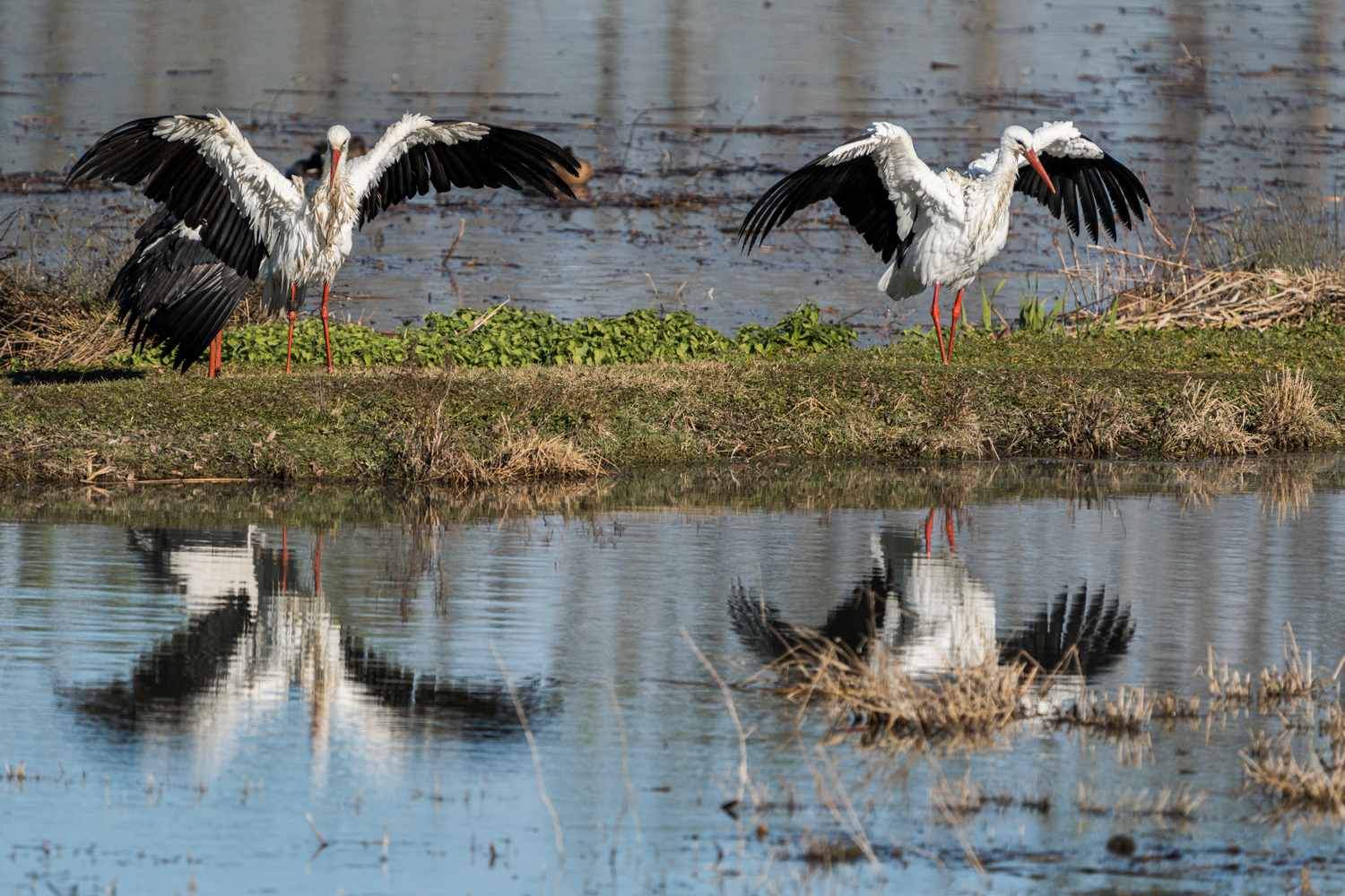 Apprezzo molto il momento colto, il riflesso e l'ambientazione delle cicogne sulla striscia di terra in mezzo alle due acque