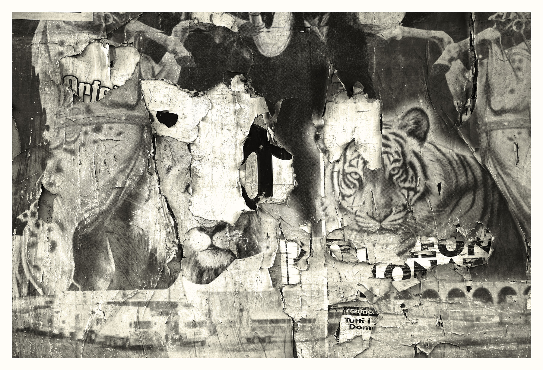 Manifesti strappati dal tempo che, grazie anche ad un efficace bianco e nero, creano una composizione affascinante… ed anche emblematica, considerato lo sguardo della tigre che sembra dire “basta con gli animali nei circhi”. Bravo Claudio, davvero molto bella Ok!