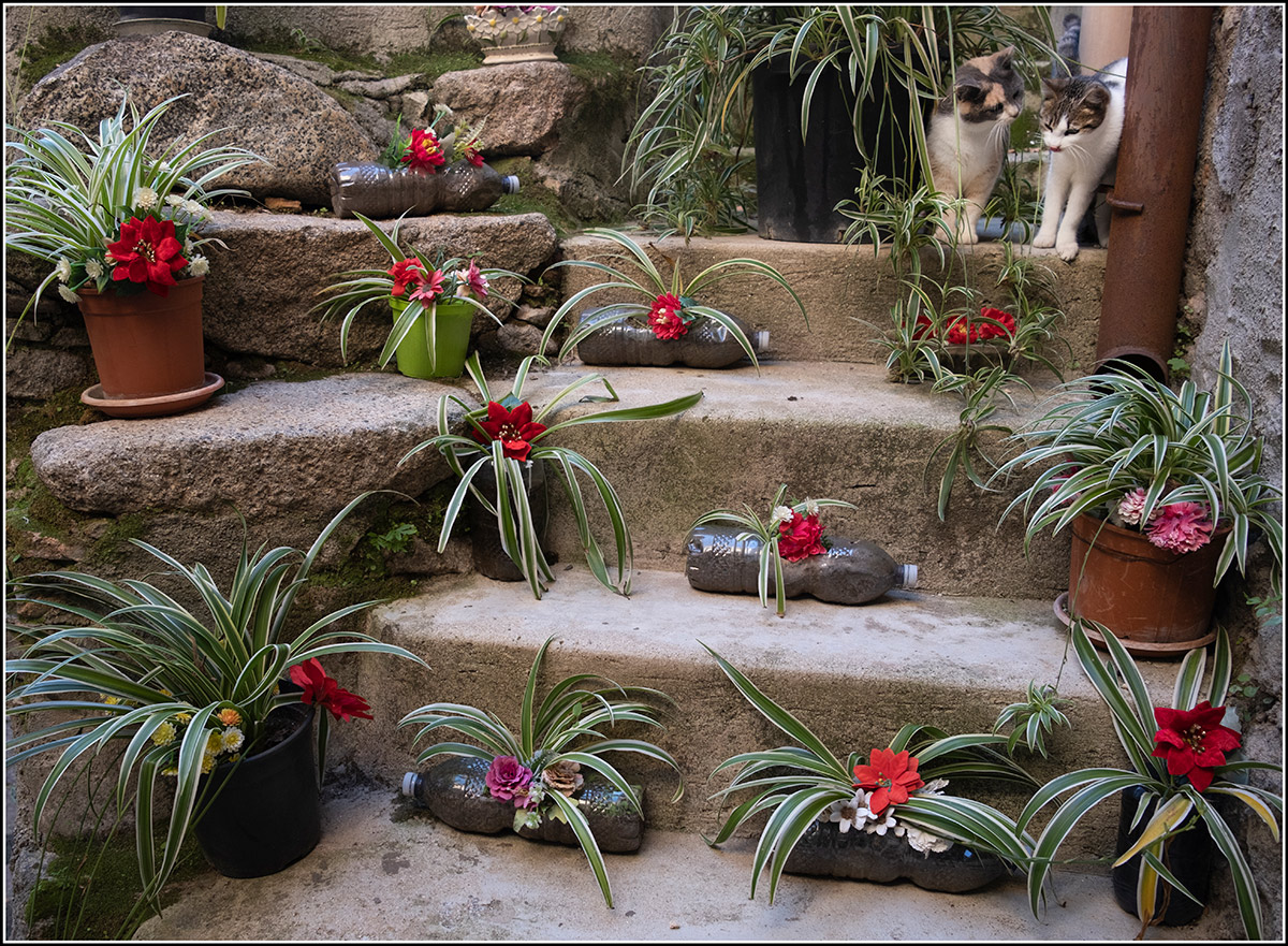 Inizialmente il titolo lo associavo ai vegetali che affollano questa scala, aprendola vedo i due micetti nell'angolo credo che i veri soggetti siano loro, composizione forse un po' frettolosa.  |