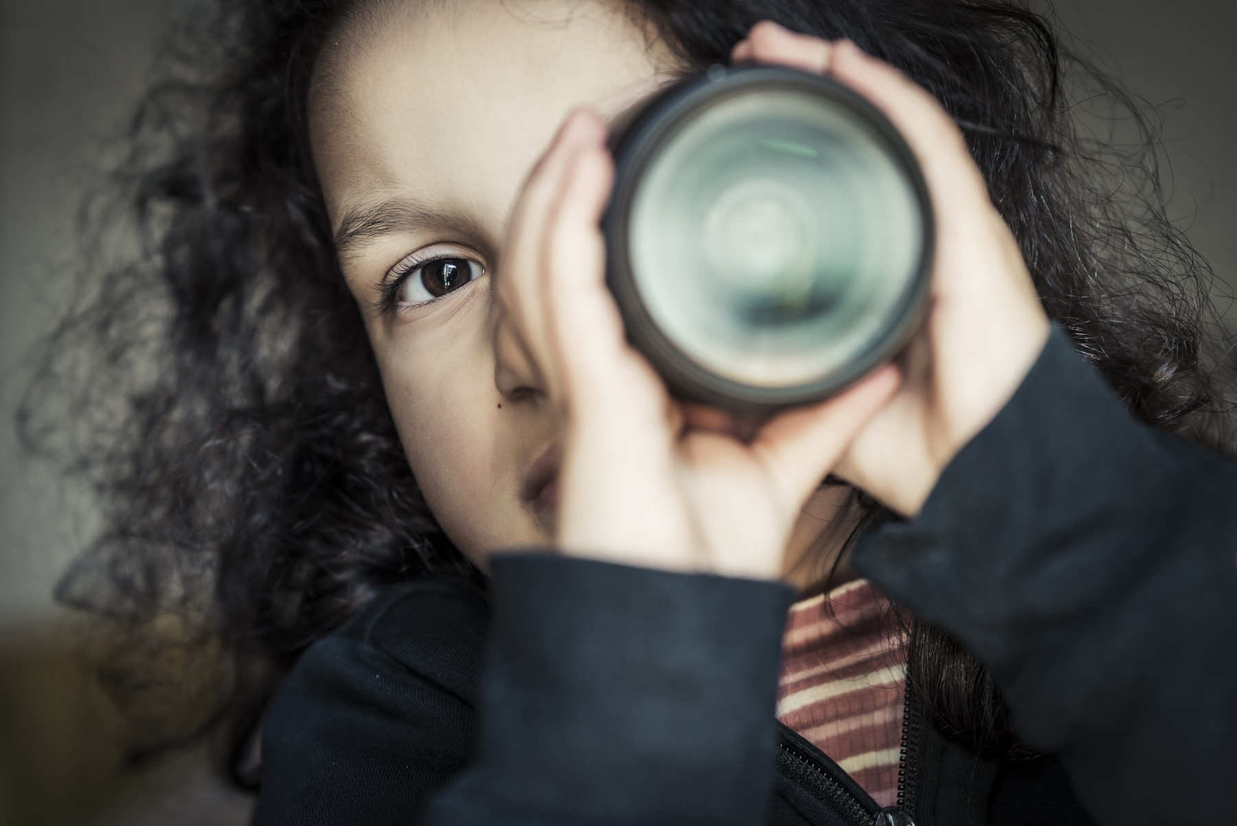 Simpatico e giocoso ritratto giocato sul tema dello sguardo, quello bellissimo, vico, diretto e penetrante della bambina, quello tecnico, idealizzato, cerebrale proprio della pratica a tutti noi nota, che si traduce nel gesto del fotografare.