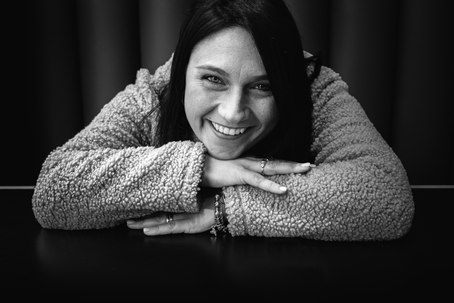 Funzionale il triangolo chiaro costituito dalle braccia a sostegno del volto.