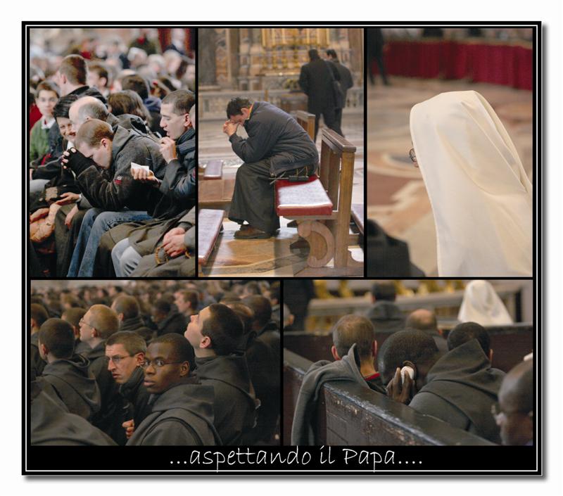 ...sono cinque foto e come dice il titolo siamo tutti in attesa del Papa... in ogni foto trovi atteggiamenti piu svariati in questa fase di attesa...c'e' chi chiacchera e ride, chi prega intensamente, chi pulisce gli occhiali, chi guada per aria, chi se guarda intorno, chi telefonaaaaa!!! .... e ce sto io che li fotografo....