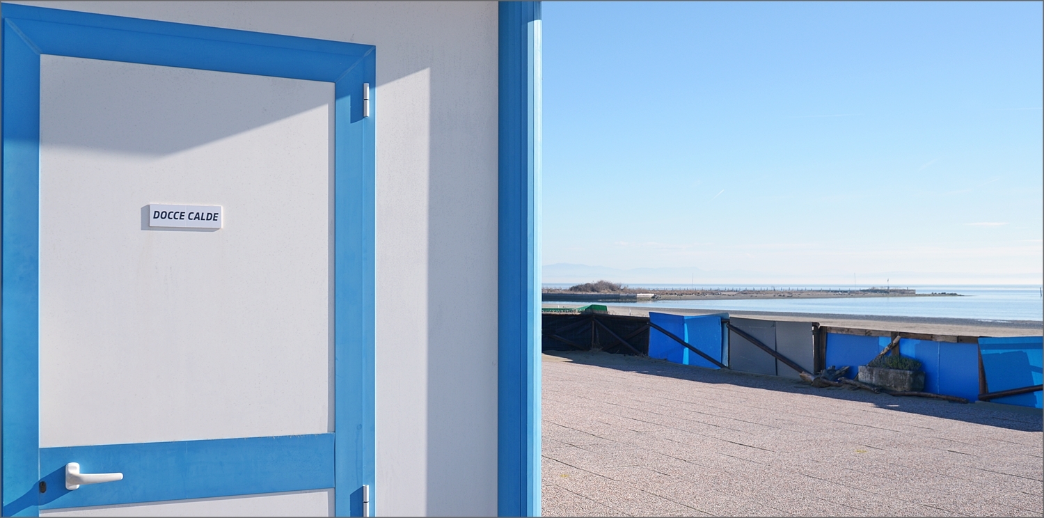 Un contrasto di sensazioni tra l'acqua fredda del mare e la scritta docce calde. Ma anche un contrasto tra i colori freddi del cielo, del mare, il celeste, il bianco e la sensazione di caldo dell'acqua della doccia.