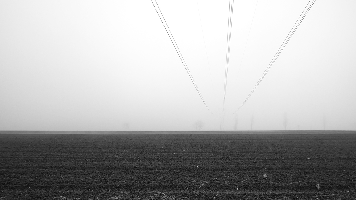 I solchi del terreno arato e poi sullo sfondo una tenue striscia di terreno dove si ergono le figure esili degli alberelli sullo sfondo di un cielo uniforme. Il cielo è solcato dai fili dell'alta tensione che si perdono in fondo nella nebbia.