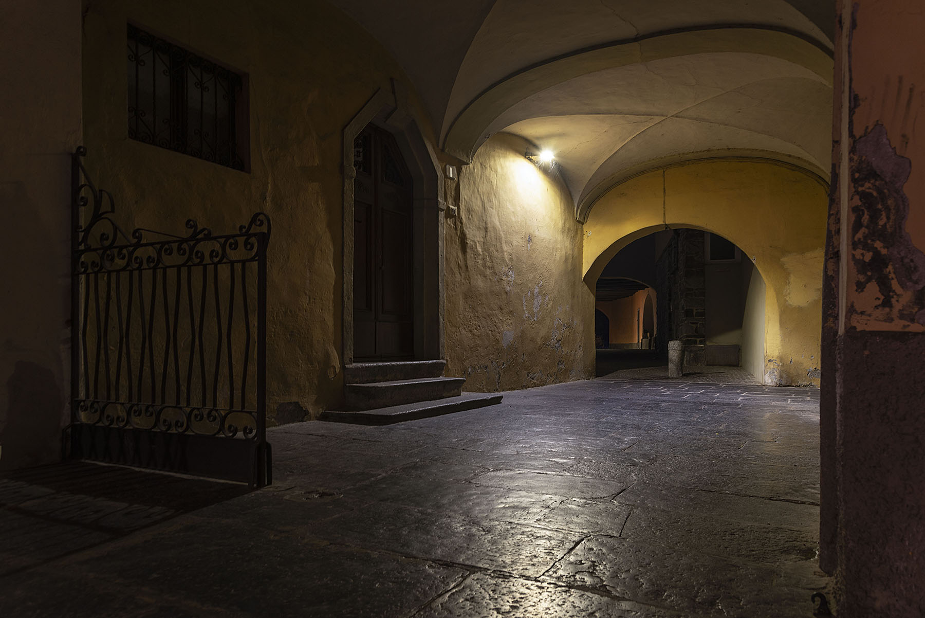 La luce da un effetto lucido, particolare, sulla pavimentazione mentre le zone in ombra o poche illuminate creano una certa suggestione confermata dall'assenza di vita.