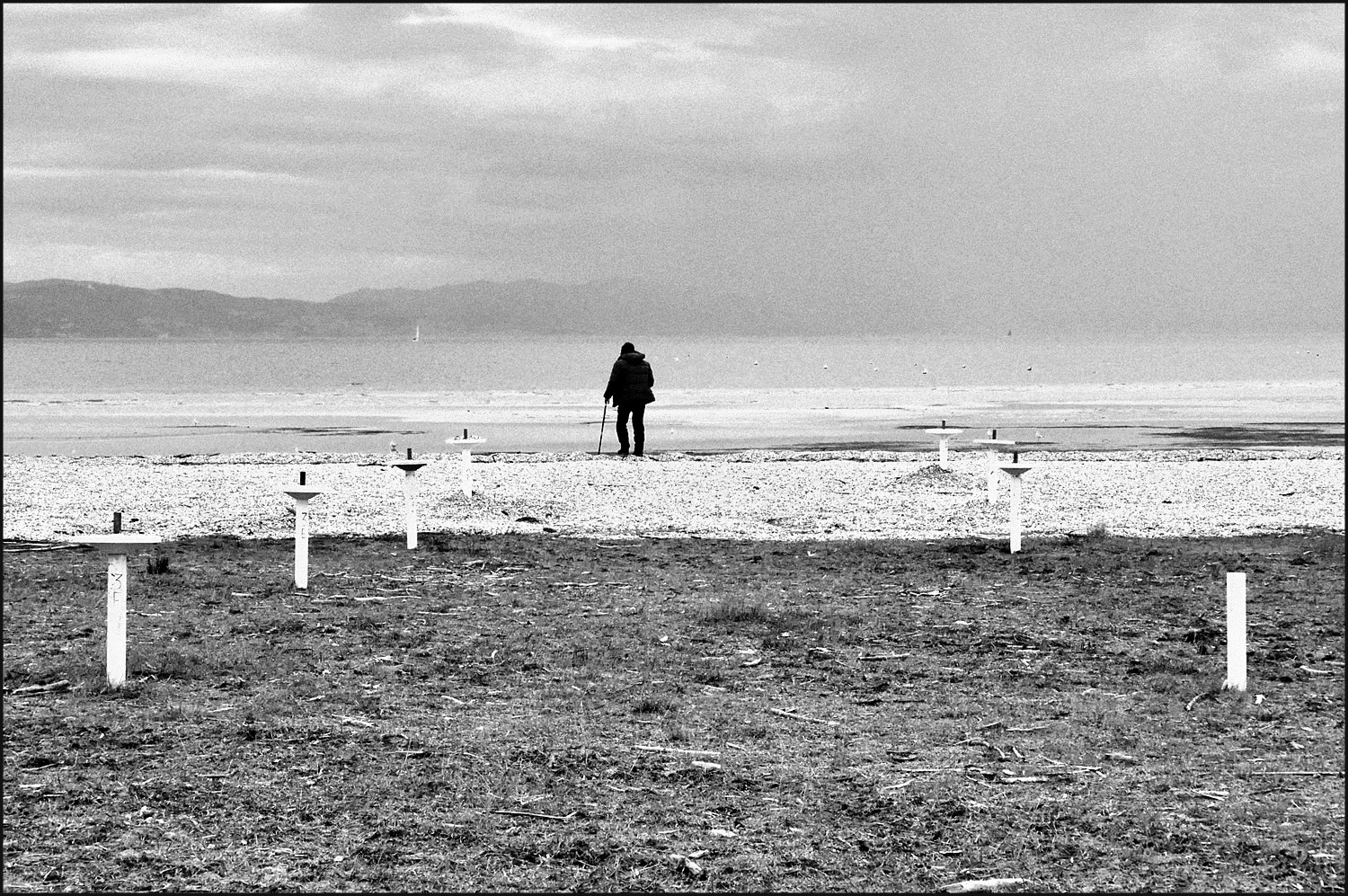 La sagoma scura dell'uomo al centro della foto tra due file di porta ombrelloni, che scruta l'orizzonte indefinito, impreciso, ci racconta una storia senza tempo ben resa da quel cielo un po minaccioso ma nel contempo pittorico.