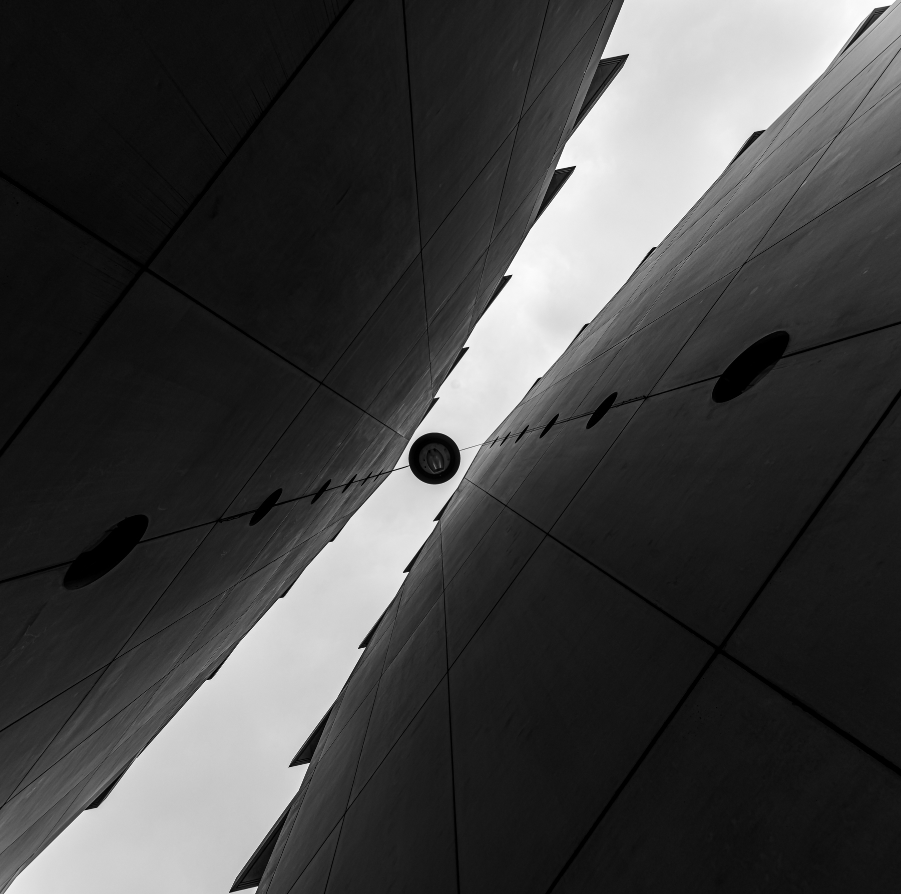 Mi sfugge il senso del titolo, ma lo scatto ha una sua sicura efficacia, il bn è equilibrato, il formato quadrato contiene bene la vista, la prospettiva vertiginosa dà dinamicità alla scena.