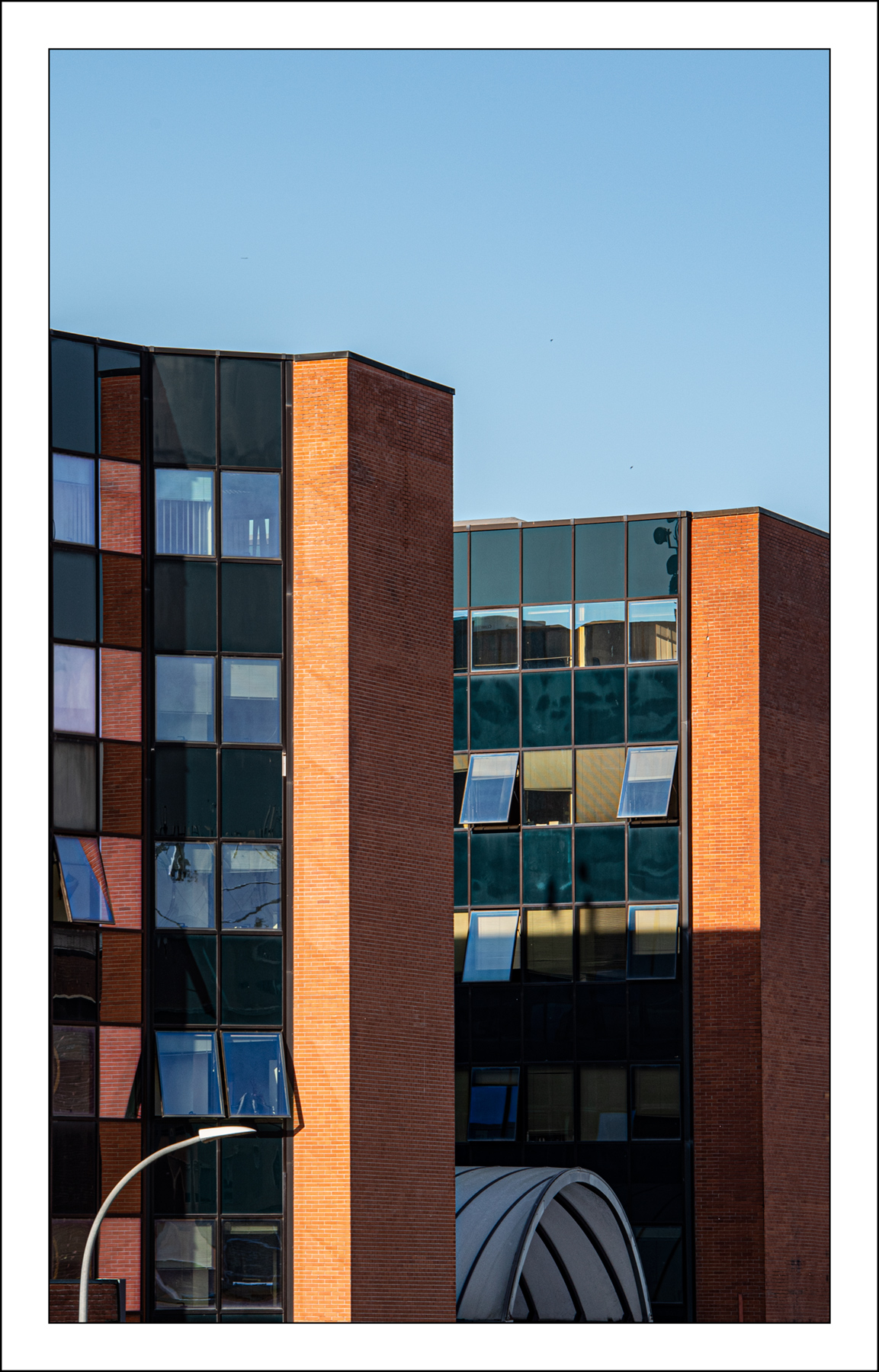 Architettura spigolosa di tessere di finestrature, addolcita in basso dalle curvature di elementi a contrasto. Ottima.