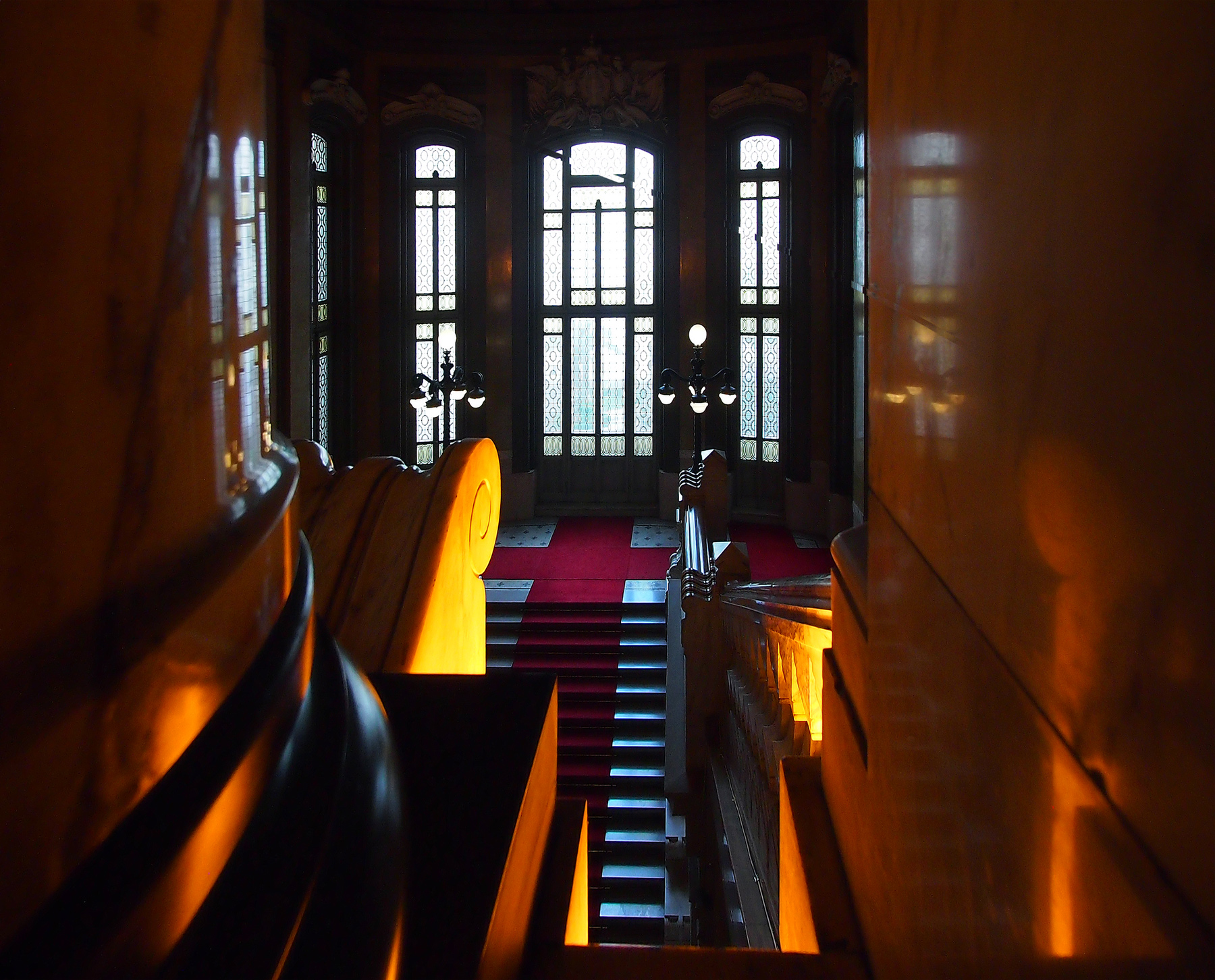 Una luce gialla che disegna parte della materia e che contrasta con la luce bianca della vetrata; i bei riflessi sui muri che racchiudono e sembrano dare continuità alle finestre; l'eleganza del palazzo, anche se un po "caotica"; ne fanno uno scatto apprezzabile e gradevole