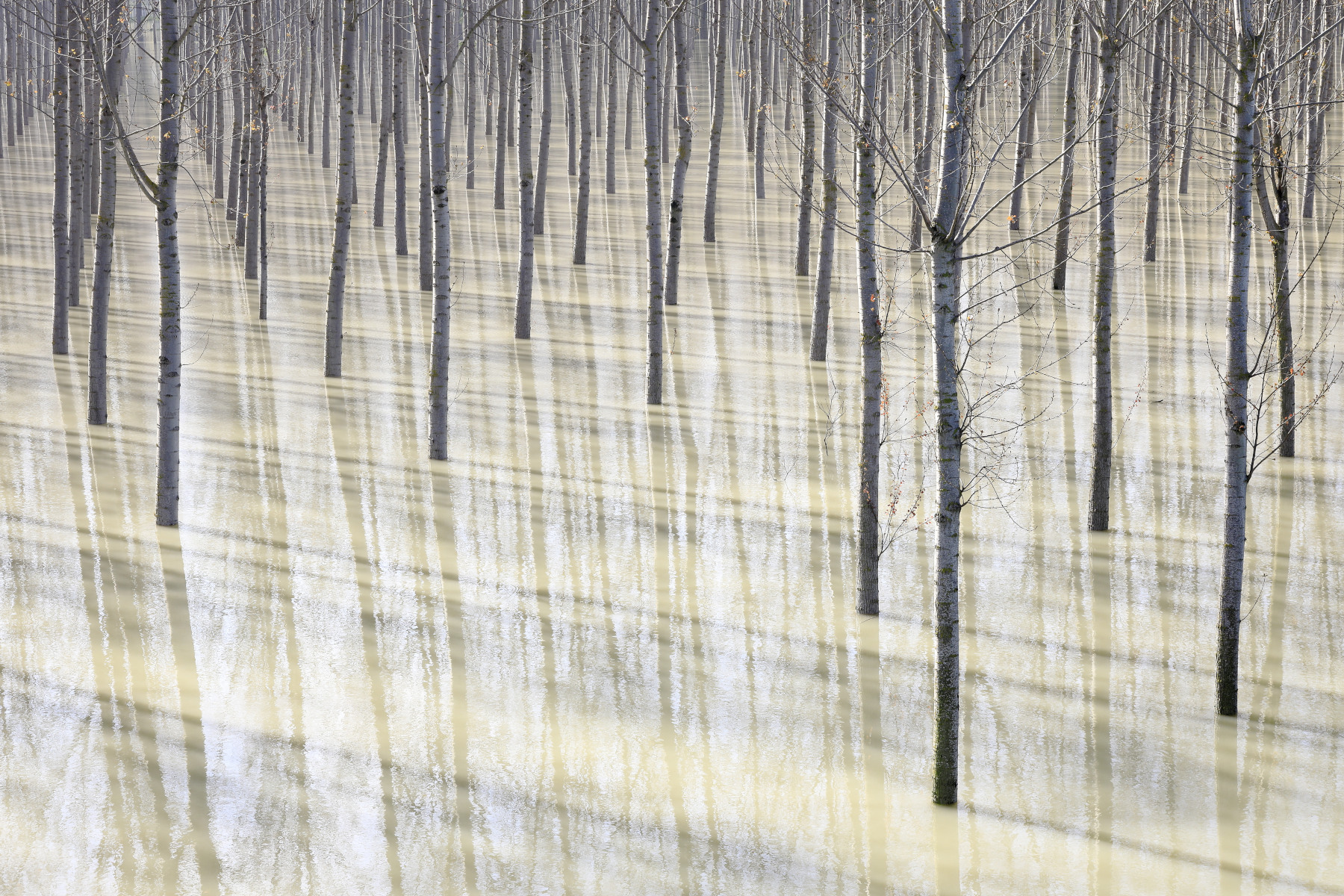 Una trama ordinata, ritmica, di alberi che si specchiano. La visione è di quella che affascina, ipnotizza.