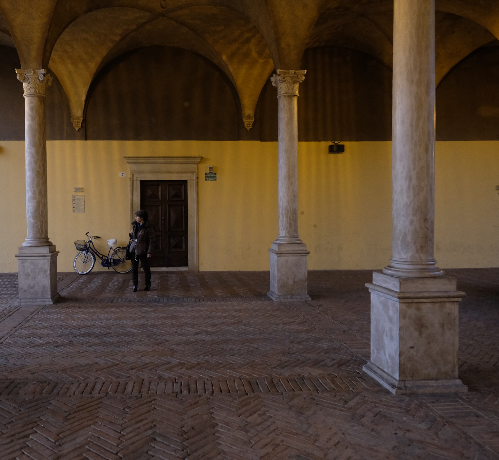 Non mi disturbano bici e persona essendo in varie, volendola vedere con occhio più archi allora direi: no alla colonna a destra e/o più soffitto e meno pavimento.  |