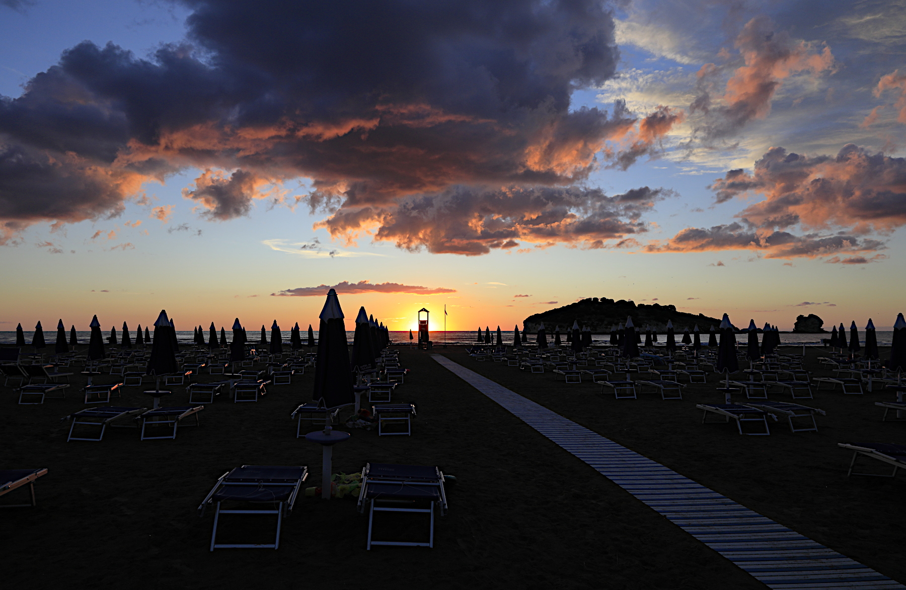 La luce che dipinge le nuvole è fantastica, ma molto bella anche quella che sfiora le sdraio vincendo l'oscurità.
