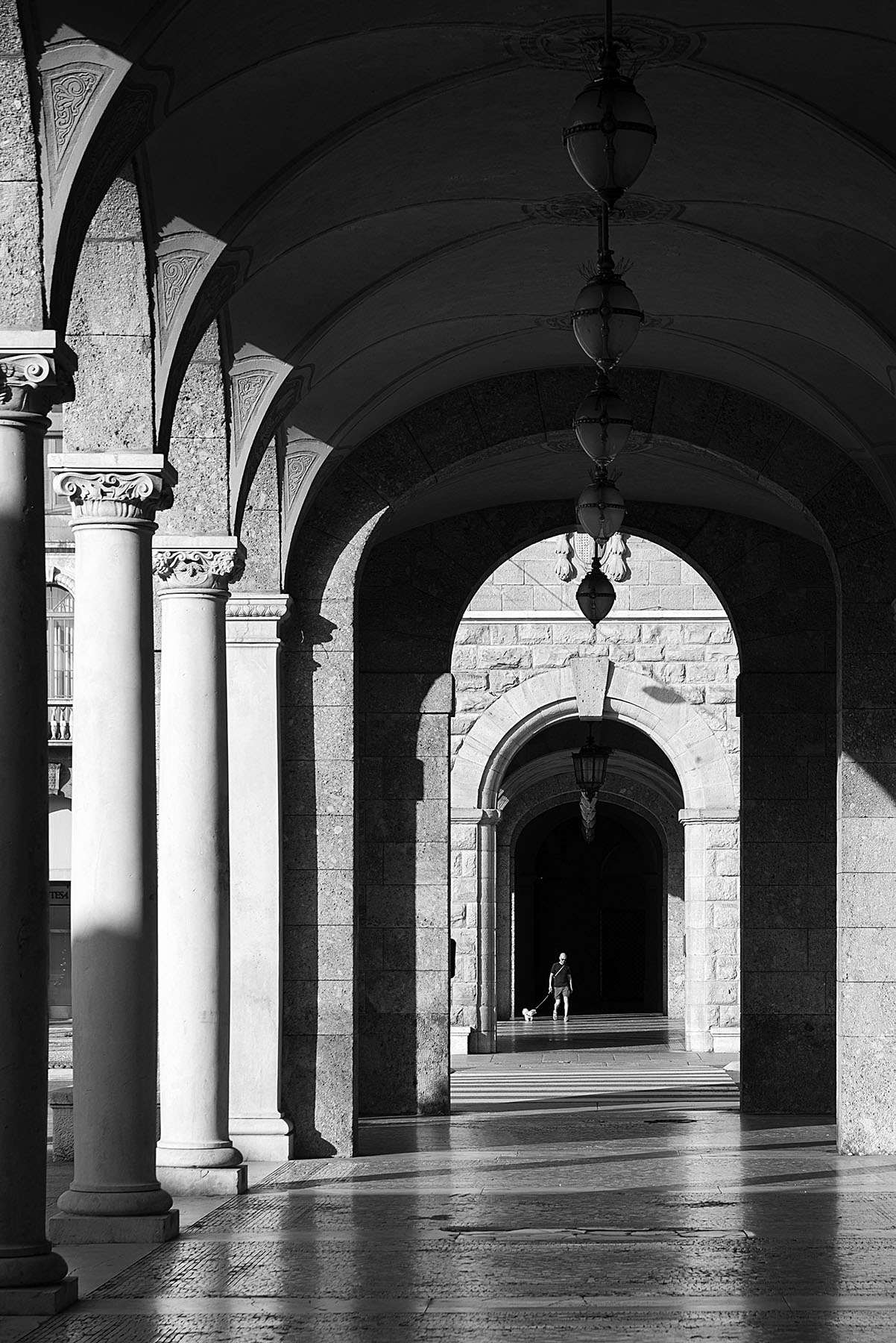 Luci e ombre donano profondità allo scatto e la persona con il cane sullo sfondo oltre a dare il senso della dimensioni è un invito ad esplorare lo spazio con le belle colonne.