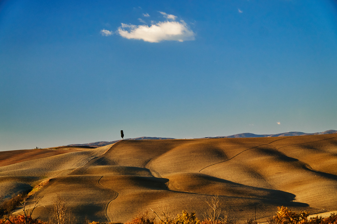 La luce bassa dona alle ondulazioni del terreno una plasticità fantastica.