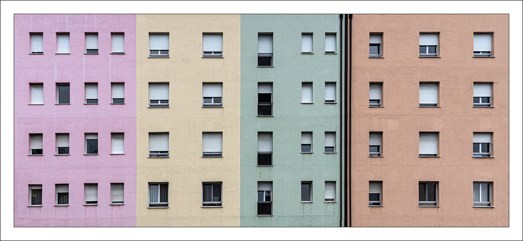Soggetto ed inquadratura molto attraenti. Certamente avrei almeno un poco ravvivato le tinte, ma anche così l'immagine è piacevole, immaginando che gli occhi vedessero in quel momento di luce i colori così delicati. Precise le linee, opportuno il taglio largo, funzionale la cornice, belle le finestre ognuna con il suo livello di altezza delle tapparelle. Mi piace assai. Ciao, Francesco _________________ Fotocamere Olympus OMD e PEN, Panasonic G3. Software GIMP