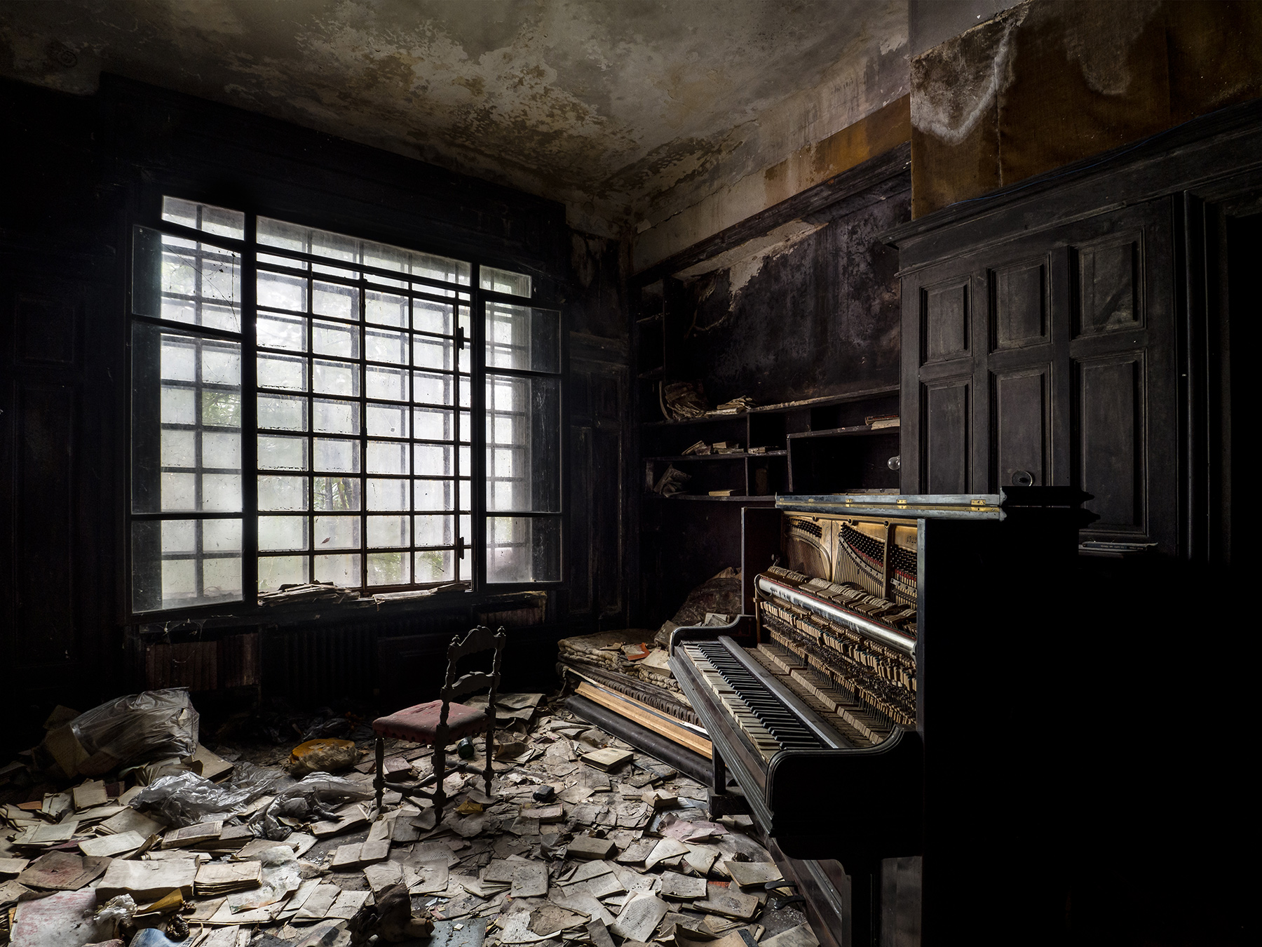 In altre foto di questa stanza precedenti rispetto alla mia i volumi sparsi sul pavimento erano riposti nella libreria che si intravede dietro il pianoforte.