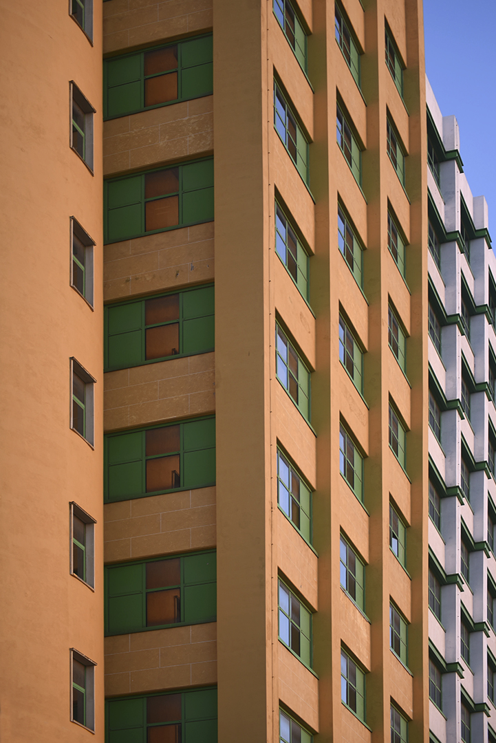 Il pattern creato dalla sequela di finestre ha un buon impatto fotografico ed anche i colori sono gradevoli, la piccola striscia di cielo ed il suo riflesso danno un quel tocco freddo che arricchisce lo scatto.