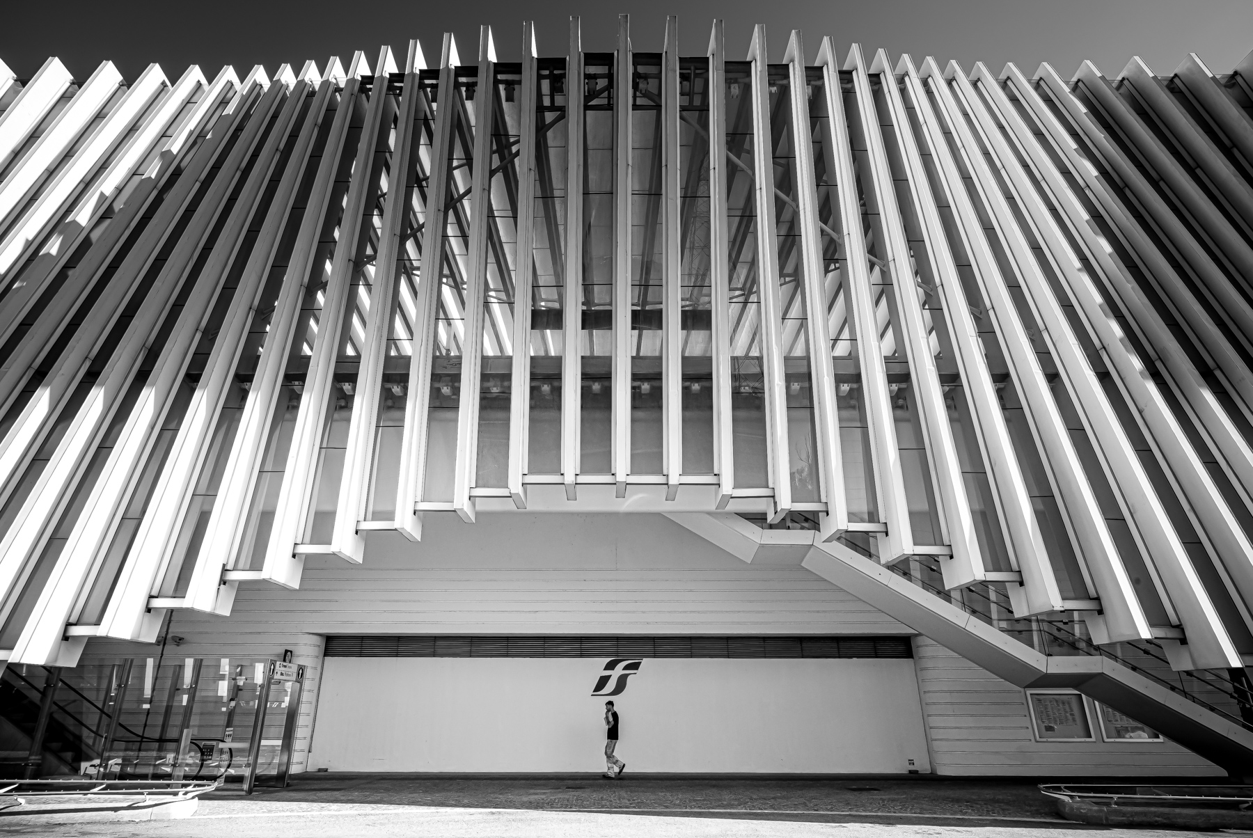 Una struttura difficile da riprendere così di prospetto, ma tu l’hai resa originale con il posizionamento del ragazzo, che aiuta anche a dimensionare. Singolare anche la decisione di non raddrizzare, a mio avviso indovinata per accentuare l’effetto “fisarmonica” Una valida proposta.