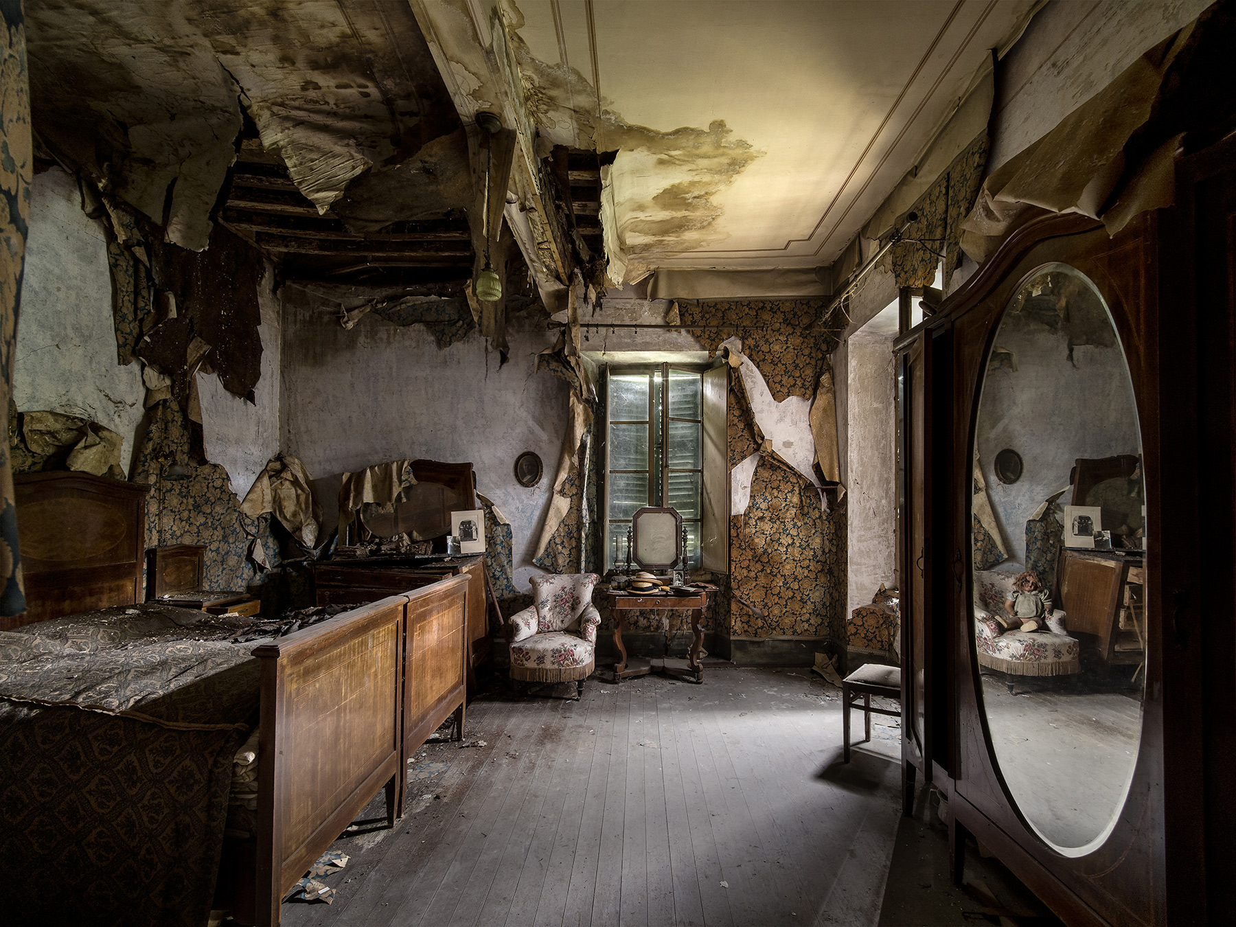| Un ambiente inquietante, fatiscente, in stato di apparente abbandono almeno in una sua parte, ma non privo di suggestione ed attrattiva. Mi colpisce l'immagine riflessa della bambola di pezza nello specchio a destra. Forse un richiamo alpassato, all'infanzia, quando non c'era il degrado dell'ambiente che anzi, forse, risplendeva del suo fascino. |