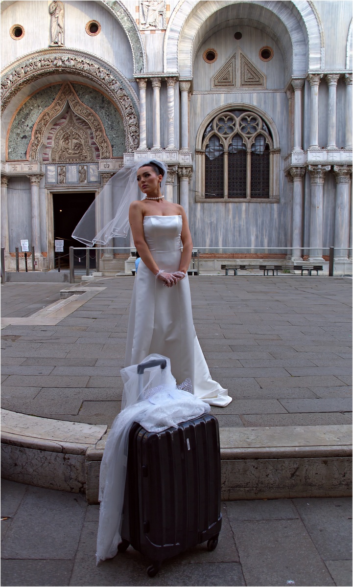 Divertente, perché sembra che la sposa stia in piedi sulla valigia Ben vista