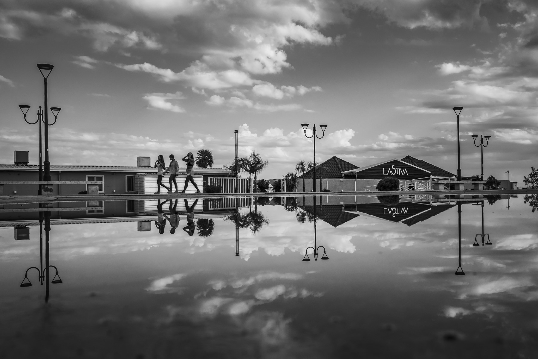 Un riflesso talmente nitido e preciso che sembra l’immagine raddoppiata… Bello il mix tra persone, strutture ed elementi ed ottimo il bianco e nero, complimenti!