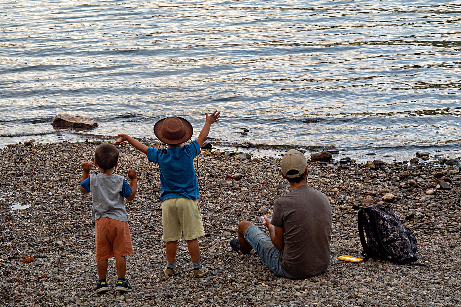 L’entusiasmo dei bimbi davanti al mare/lago è il focus tanto da rendere praticamente ‘superflua’ la presenza dell’adulto e dello zainetto.