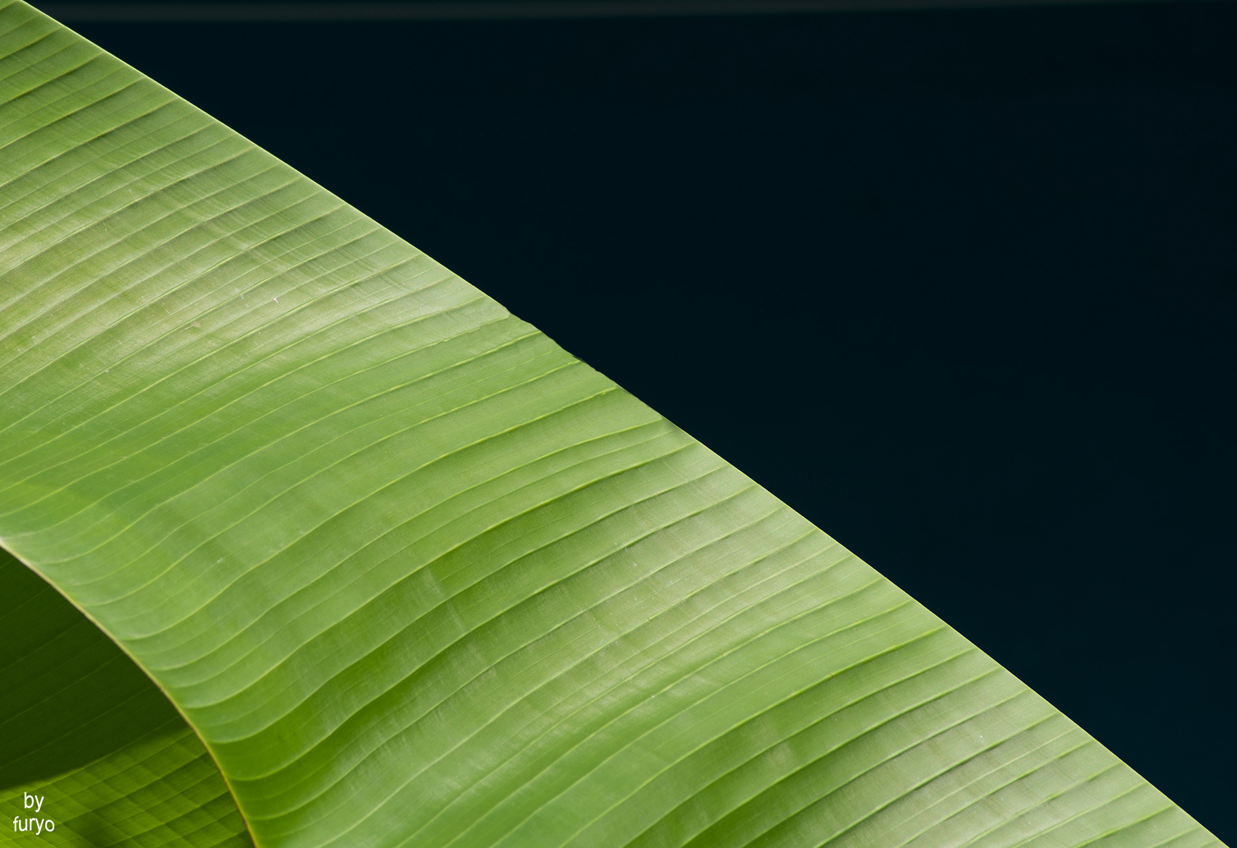 Trovo che la composizione obliqua vada bene, avrei solamente riempito la metà di destra con uno sfondo meno scuro omogeneo, eventualmente dello stesso banano, magari sfocato… Comunque i gusti sono personali