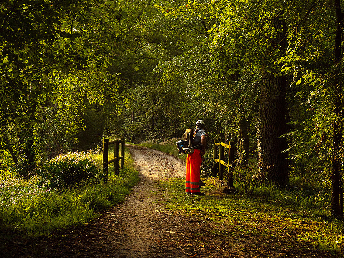 una bella foto, un bello scorcio di bosco con il suo ponticello, e quel tocco di rosso, nel verde, dei pantaloni della persona ripresa a fare il suo lavoro, riempie il "fotogramma"...